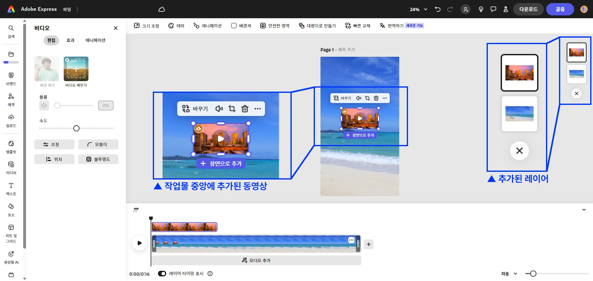 불러온 동영상은 중앙에 생성되었고 우측에 새로 불러온 동영상의 레이어까지 생성된 것을 확인할 수 있습니다!