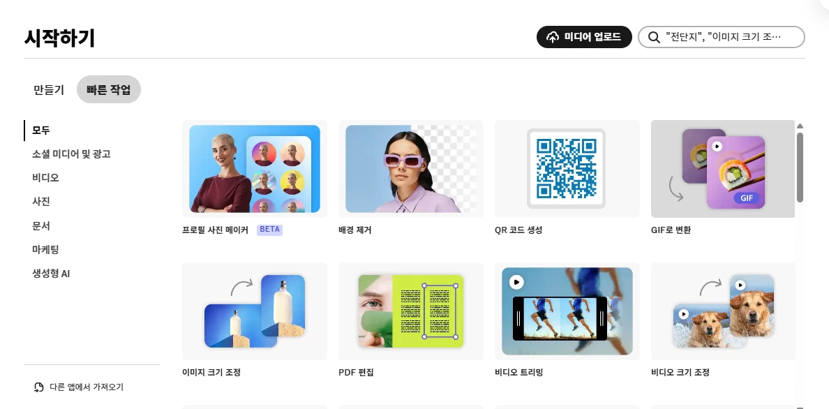 '시작하기' 글씨 하단에 '빠른 작업'을 눌러주시고 GIF로 변환을 눌러줍니다!