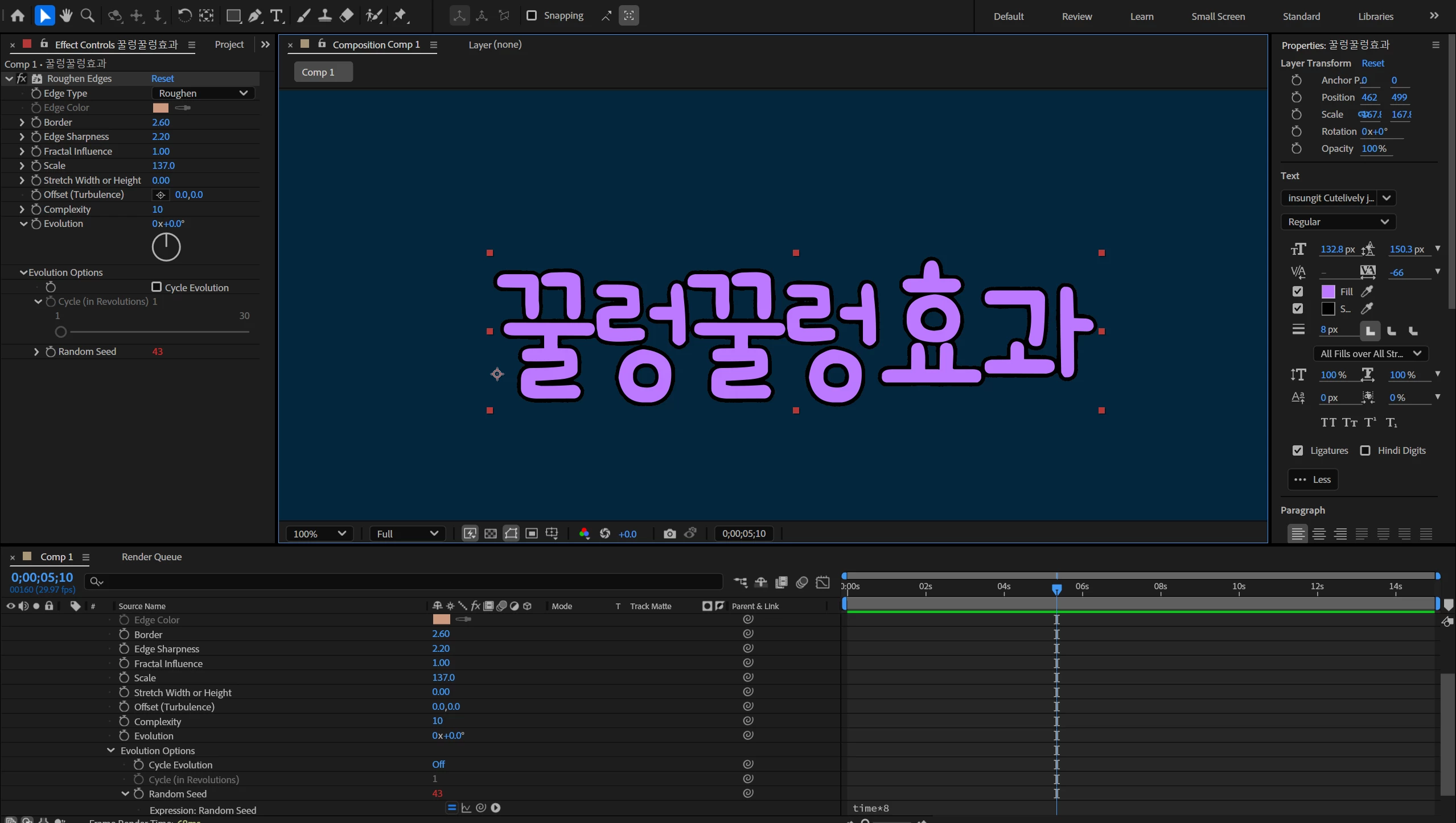 안녕하세요 꿀렁이는 효과 넣고 싶어서 roughen egde사용하니까 이게 스트로크가 있으면 안되는건가요? 스트로크 없을때는 잘 꿀렁이는데 스트로크 있으면 꿀렁이는게 안에만 하고 검정색 테두리는 그대로 가만히있어서 꿀렁이는게 안 보이네요 ㅜㅜ 전체를 꿀렁이는 방법있을까요?