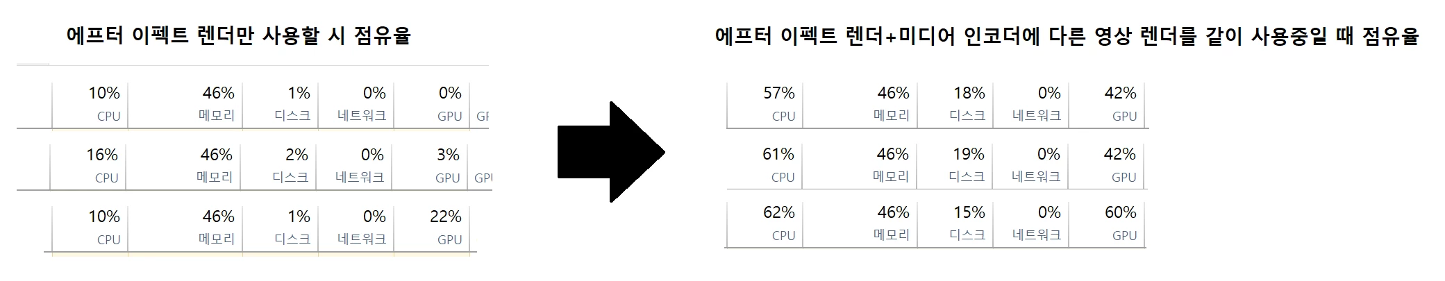 에펙 멀티렌더 중+미디어인코더 렌더를 같이 돌리면 갑자기 CPU+GPU 점유율 40~60%이상으로  높아지면서 에펙 렌더도 훨씬 빨라집니다. (캡쳐본 확인해주세요)