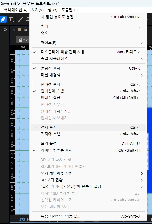 우선 상단에 눈금자 표시와 격자 표시를 눌러 눈금자와 격자를 켜줍니다.