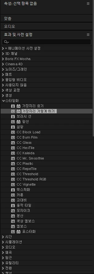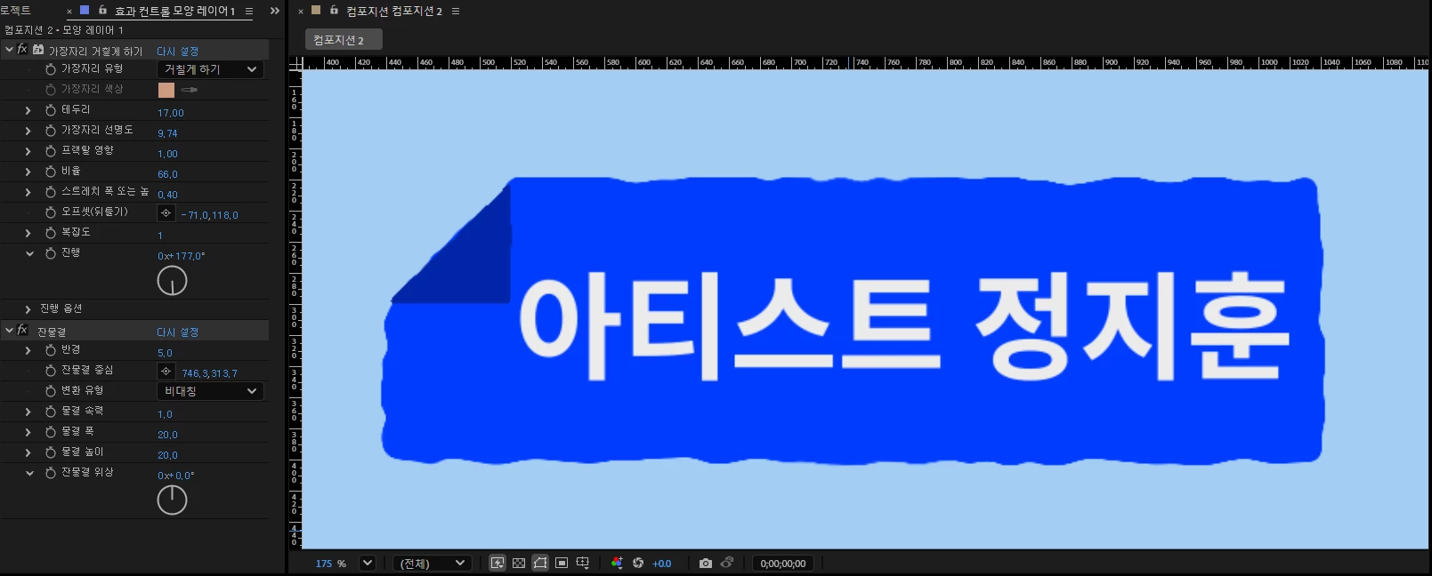 효과 및 사전 설정 메뉴에서 스타일 메뉴의 '가장자리 거칠게 하기' 효과, 왜곡의 잔물결 효과 등을 '다각형 레이어1' 에 드래그앤 드랍으로 효과를 넣어 줍니다.