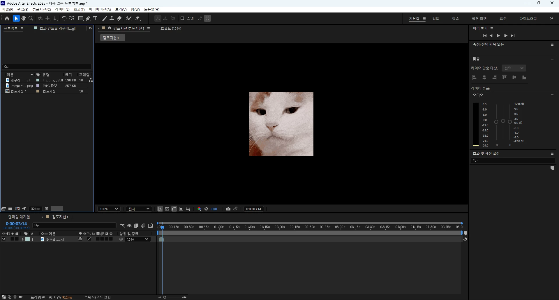 현재 올려주신 이미지에는 생성된 '컴포지션'외에 다른 소스가 보이지 않고 타임라인에도 미디어 소스나 프리뷰 화면에 표시할 소스가 보이지 않습니다.
