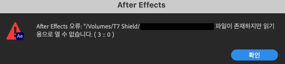 KKYOUNG CHAN33332796jrd3ParticipantForum|Forum|1 year agoMarch 4, 2024Answered애프터이펙트 오류 3::0Forum|Forum|1 year agoMarch 4, 20241 reply856 views애프터이펙트에서 외장하드에 있는 사진이나 동영상을 열면 오류가 뜹니다.외장하드 읽기 쓰기 권한 허용 되어있고, 애프터이펙트도 모든 파일 권한 다 되어있습니다.프리미어프로는 이런 문제가 발생하지 않는데 애프터이펙트만 오류가 뜹니다, 어떻게 해결해야 할까요.사용기기는 맥북이고, 외장하드는 삼성 t7 shield 입니다. ExFAT입니다.버그