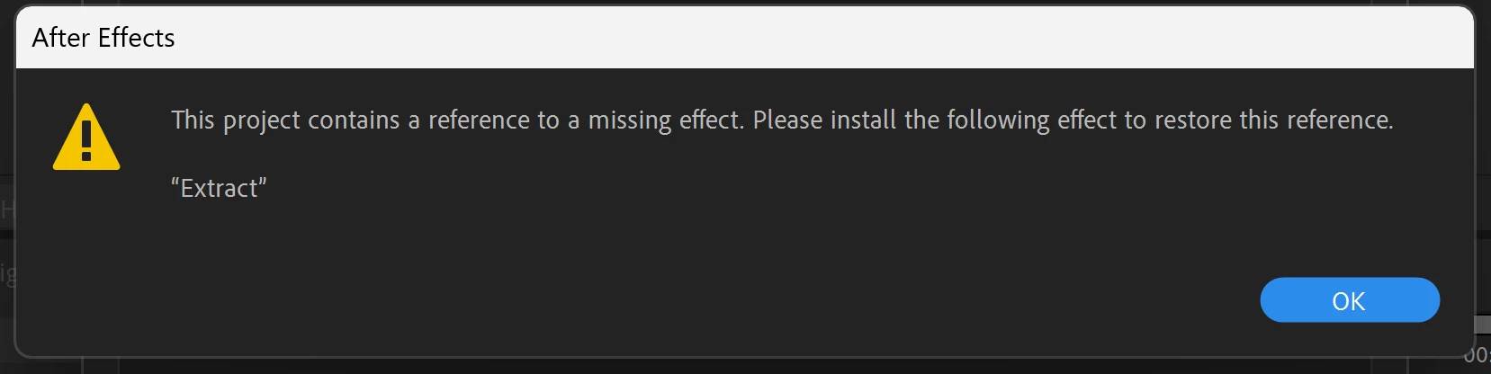 ”Extract” 효과가 누락되었다는 오류창입니다. Extract은 Keying 탭에 들어있는 기본 효과이기 때문에
