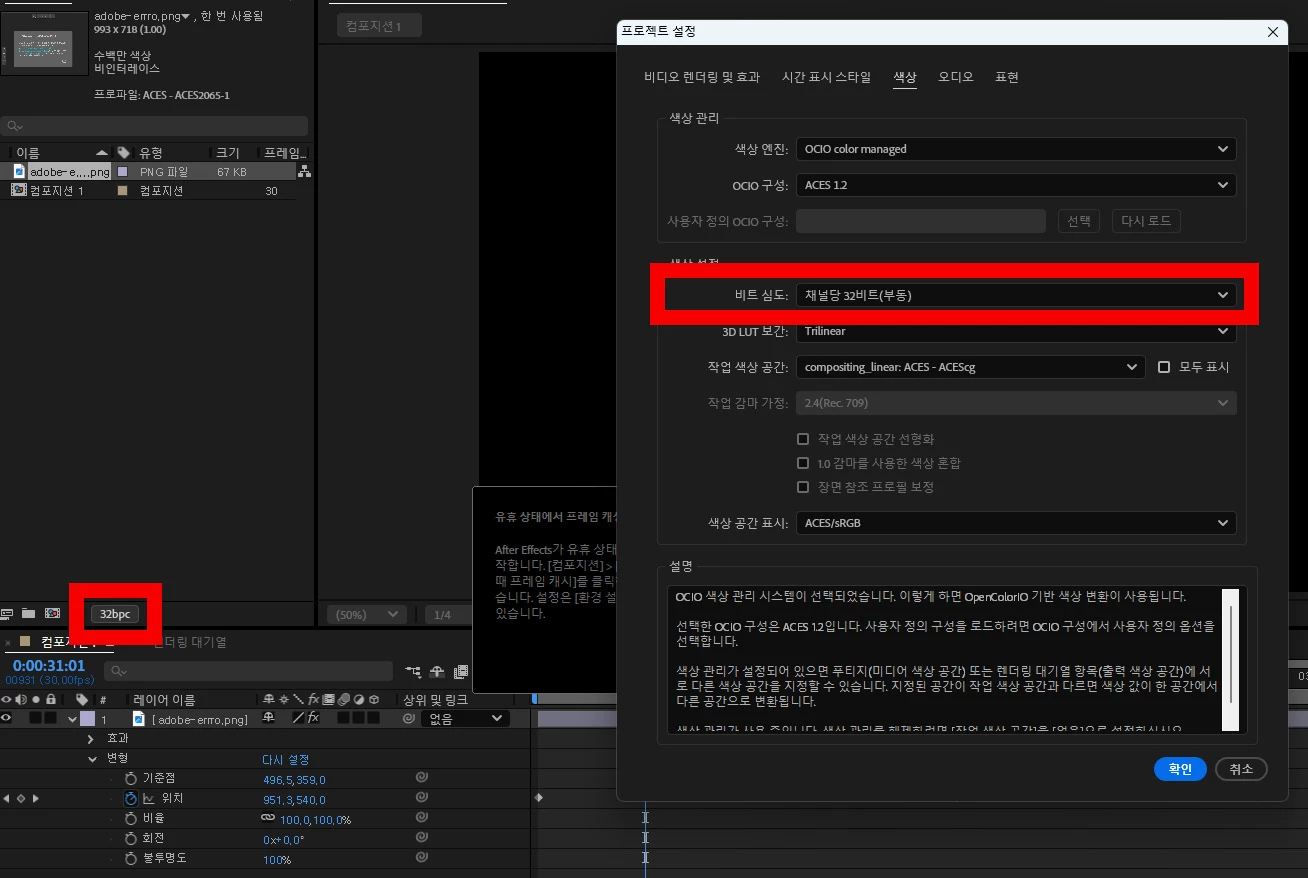 한 번 컴포지션의 채널당 비트심도를 32비트로 변경후에 테스트 해보시겠어요?