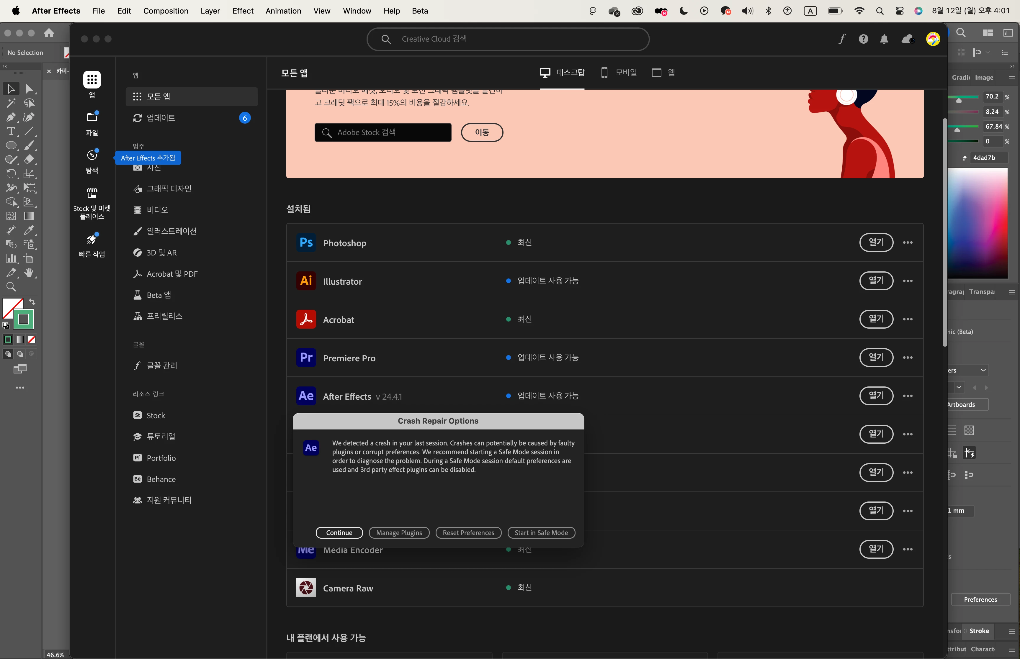 After effects의 기존 환경 값이 남아있는 폴더를 삭제 후 실행해보시길 바랍니다.