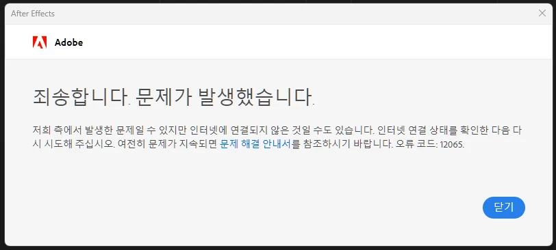 애프터 이팩트를 실행하고 나면 이런 화면이 뜨면서 작동하지 않습니다. 인터넷 연결은 잘 되어 있는데 무엇이 문제인지 모르겠습니다.