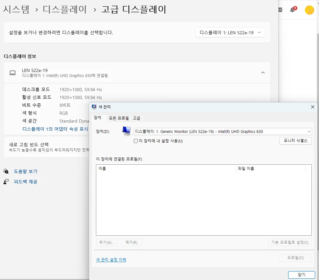 한번 상위 이미지처럼 시스템 > 디스플레이 > 고급 디스플레이 에서 디스플레이 어뎁터 속성을 열어 > 색관리 탭을 누르신후 한번 장치에 연결된 다른 색프로필이 연결되어 있지는 않은지 확인해볼수 있습니다.