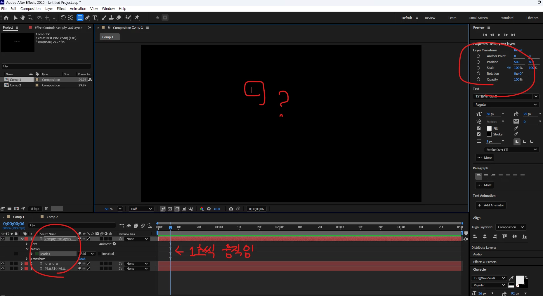 컴포지션에 텍스트나 도형 등 작업을 해도 화면에 표시되지 않고, 좌표 정보값만 표시됩니다.