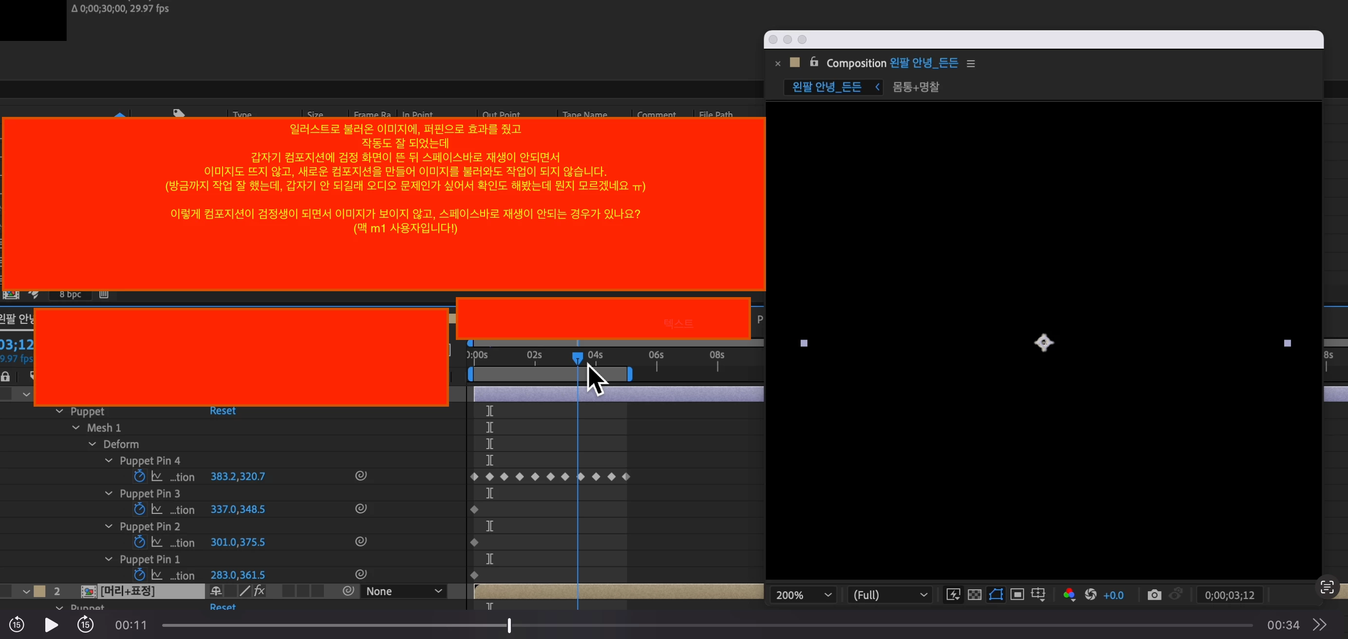 갑자기 컴포지션에 검정 화면이 뜬 뒤, 스페이스바로 재생이 안 되면서 이미지가 뜨지 않고 새로운 컴포지션을 만들어 이미지를 불러와도 작업이 안되네요.. ㅠ