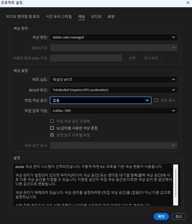 이걸 키면 애프터 이펙트에서 모니터의 색상 프로필을 사용해서 미리보기 뷰 의 색상을 조정합니다.