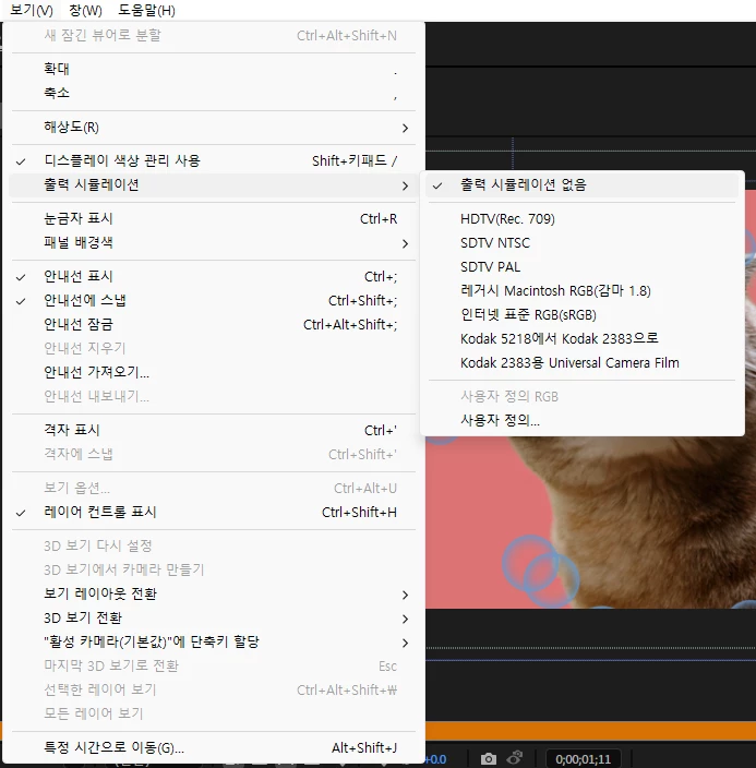 그리고 나서 상단의 보기 메뉴에서 디스플레이 색상관리 사용을 켜줍니다.
