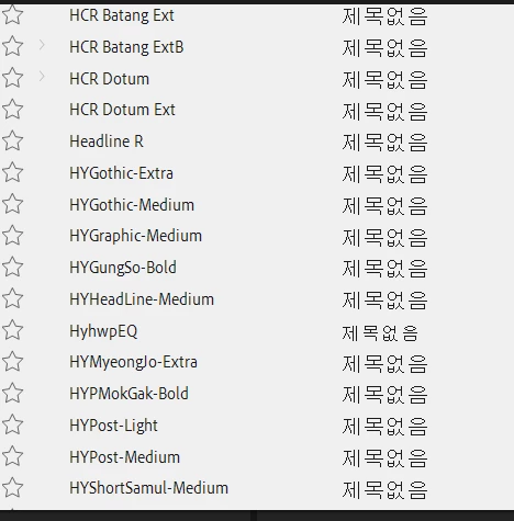영어는 샘플이 뜨는데 한글은 어떤 폰트인지 샘플이 안나오고 제목없음만 뜹니다.