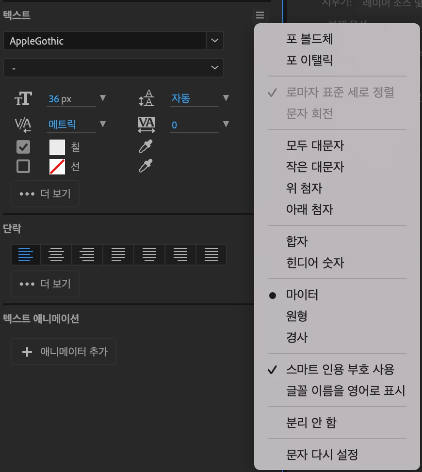 텍스트 패널 우측 메뉴 아이콘 - 문자 다시 설정을 클릭해 보신 후에도 같은 문제가 일어나시나요?