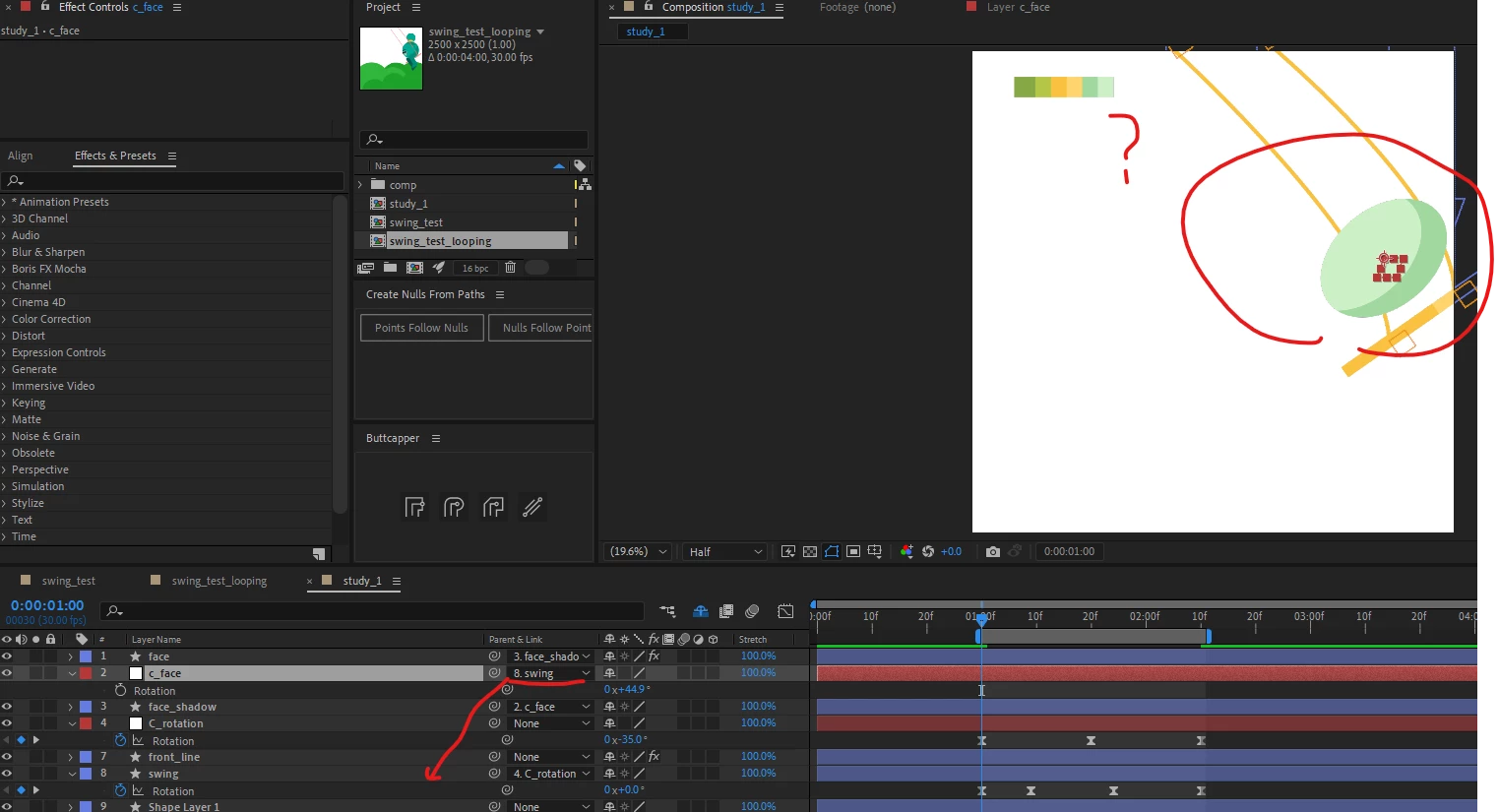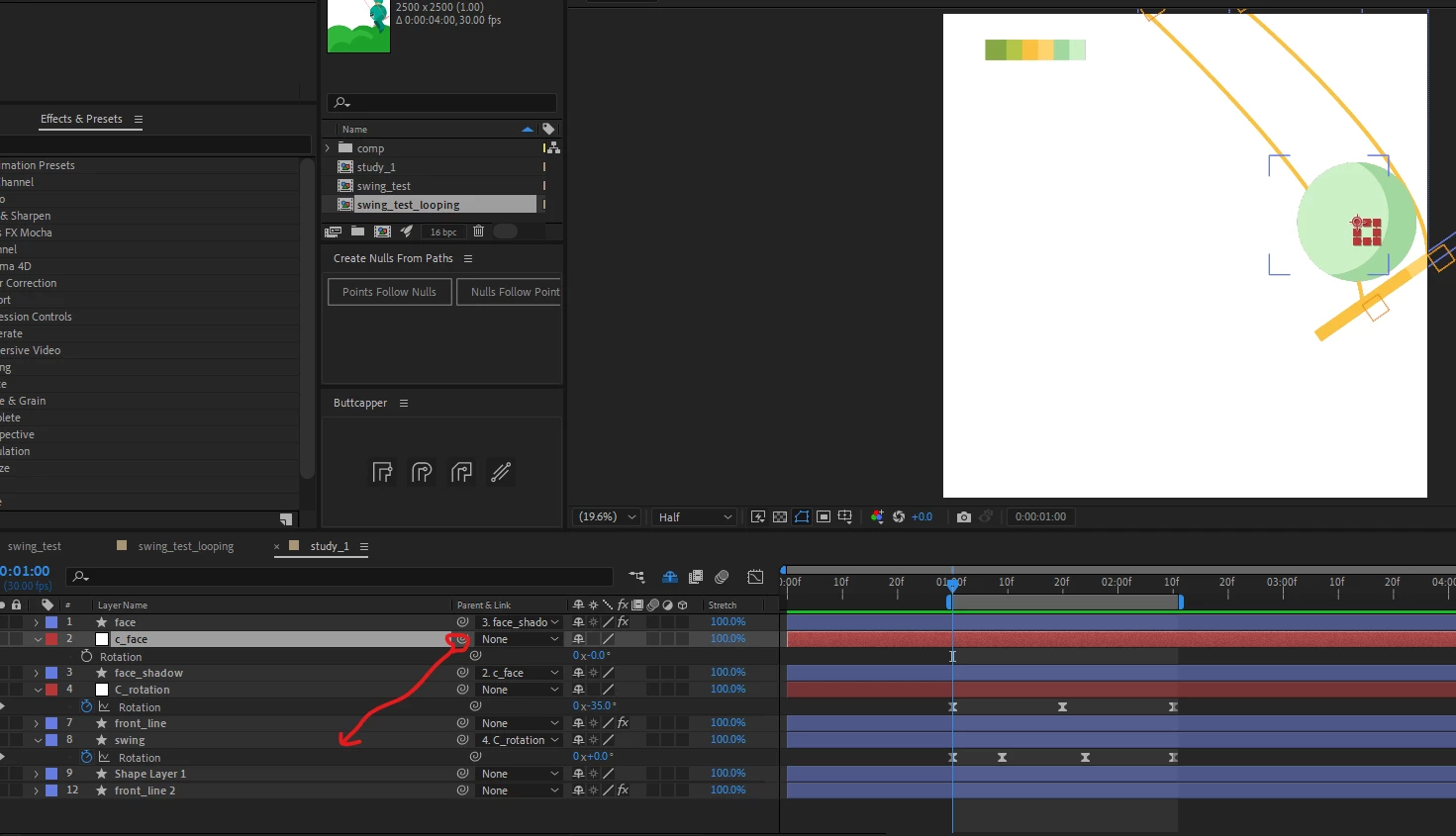 face라는 null레이어를 swing에 페어런트를 해야하는데 그러면 저는 원이 찌그러집니다...