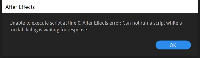 Unable to execute script at line 0. After Effects error : Can not run a script while a modal dialog is waiting for response. 라는 메세지와 함께 자동으로 튕기는 현상이 계속 됩니다..
