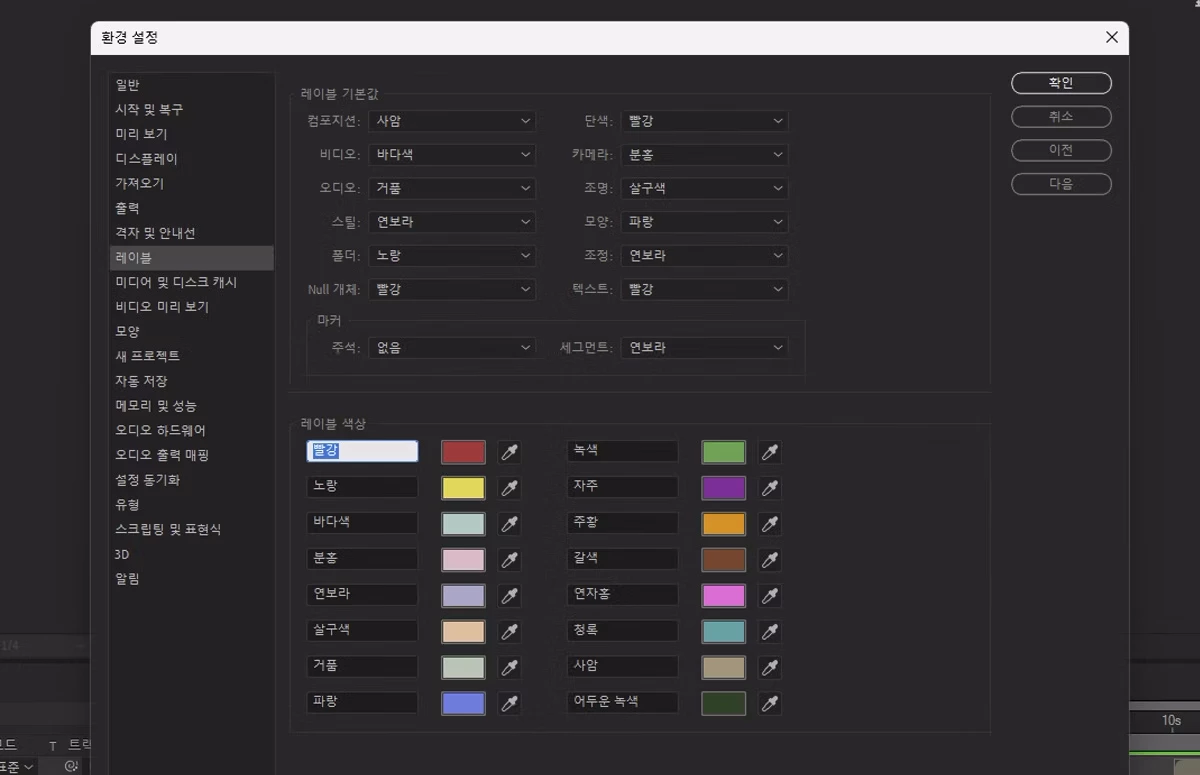 프로젝트 항목, 키프레임, 레이어 또는 컴포지션 마커 레이블에 설정할 색상을 쉽게 식별할 수 있습니다.