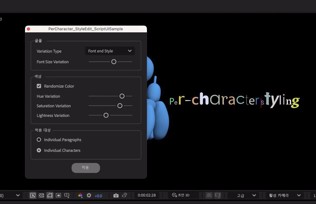 스크립팅을 사용하여 텍스트 레이어 내 문자의 모양과 애니메이션을 보다 세밀하게 제어할 수 있습니다.