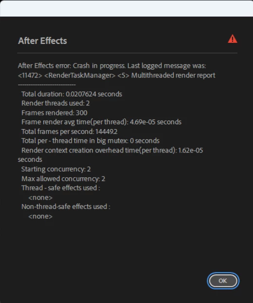애프터 이펙트에서 3d 효과 켜고 작업하면 렌더링 하는 과정에서 이미지와 같이 오류 메세지가 뜨면서 애펙이 꺼집니다. 레이어가 많은 것도 아니고 3d 레이어 2-3개 라이트 1개 카메라 레이어 1개 있는데도 그래요...