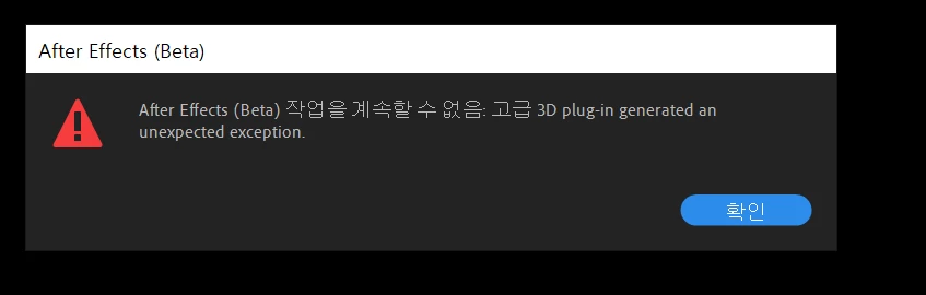 After Effects Beta에서 3D 오브젝트를 불러오면 이런 문구가 뜨면서 튕겨져 나갑니다