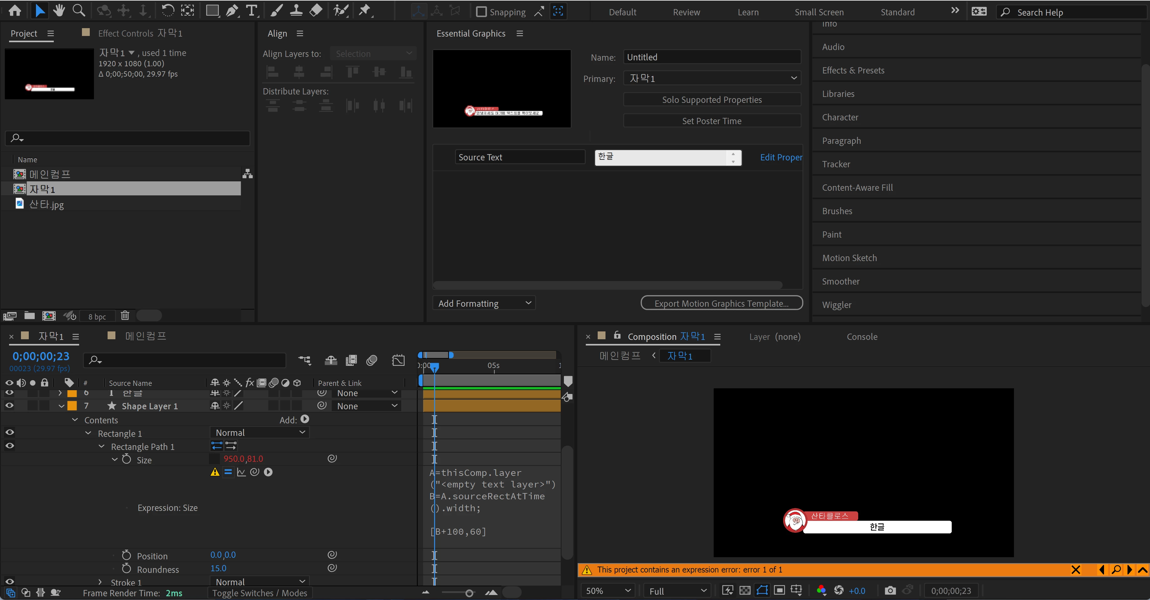 I think after effects can't read the korean in the expression and i don't know why