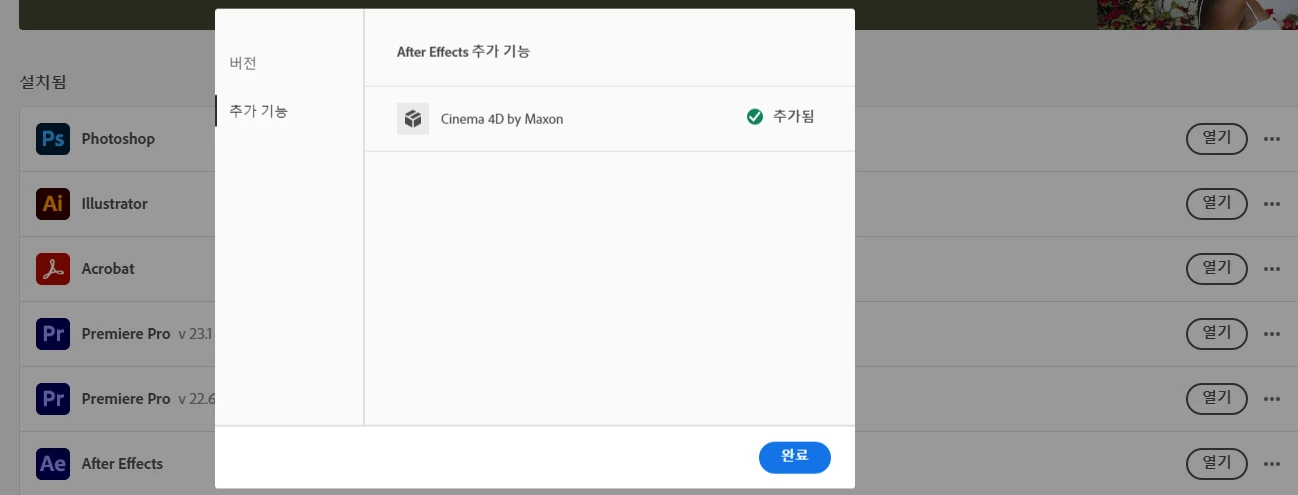 저는 지금 애프터이펙트 최신버전 쓰고 있고 추가 기능에서 c4D도 최신 버전 쓰고 있는데