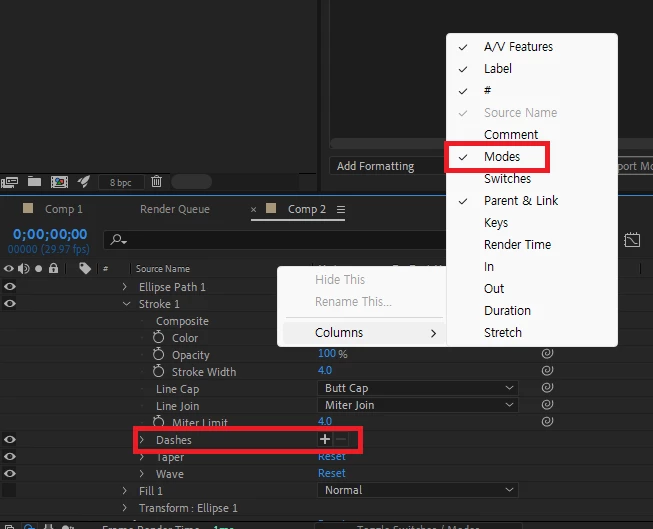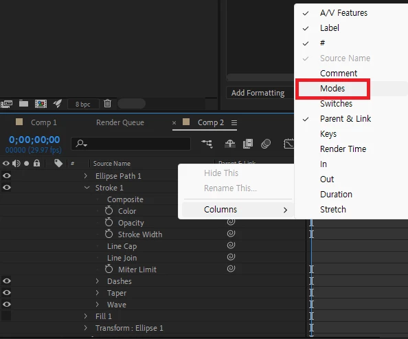 타임라인의 Source Name 항목에서 마우스 우클릭 Columns - Modes 옵션을 활성화 합니다.