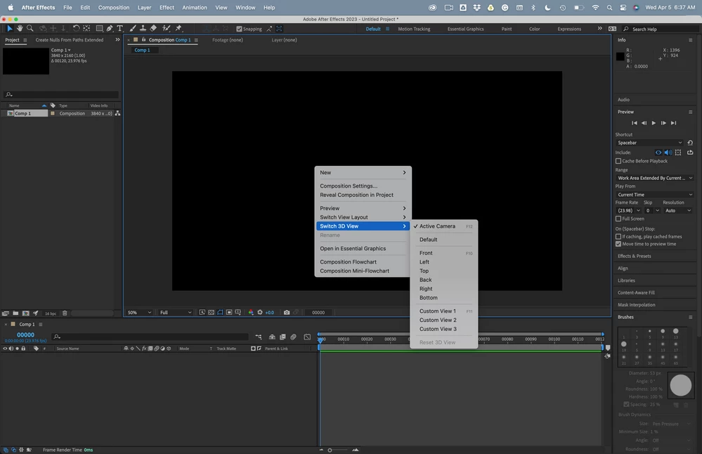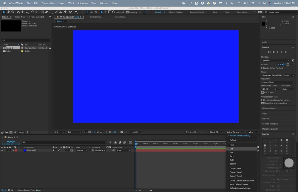 3D 레이어가 있는 경우 기본 컴포지션 패널의 오른쪽 하단 모서리에 보기 옵션과 각 패널의 드롭다운 선택 항목이 표시됩니다.