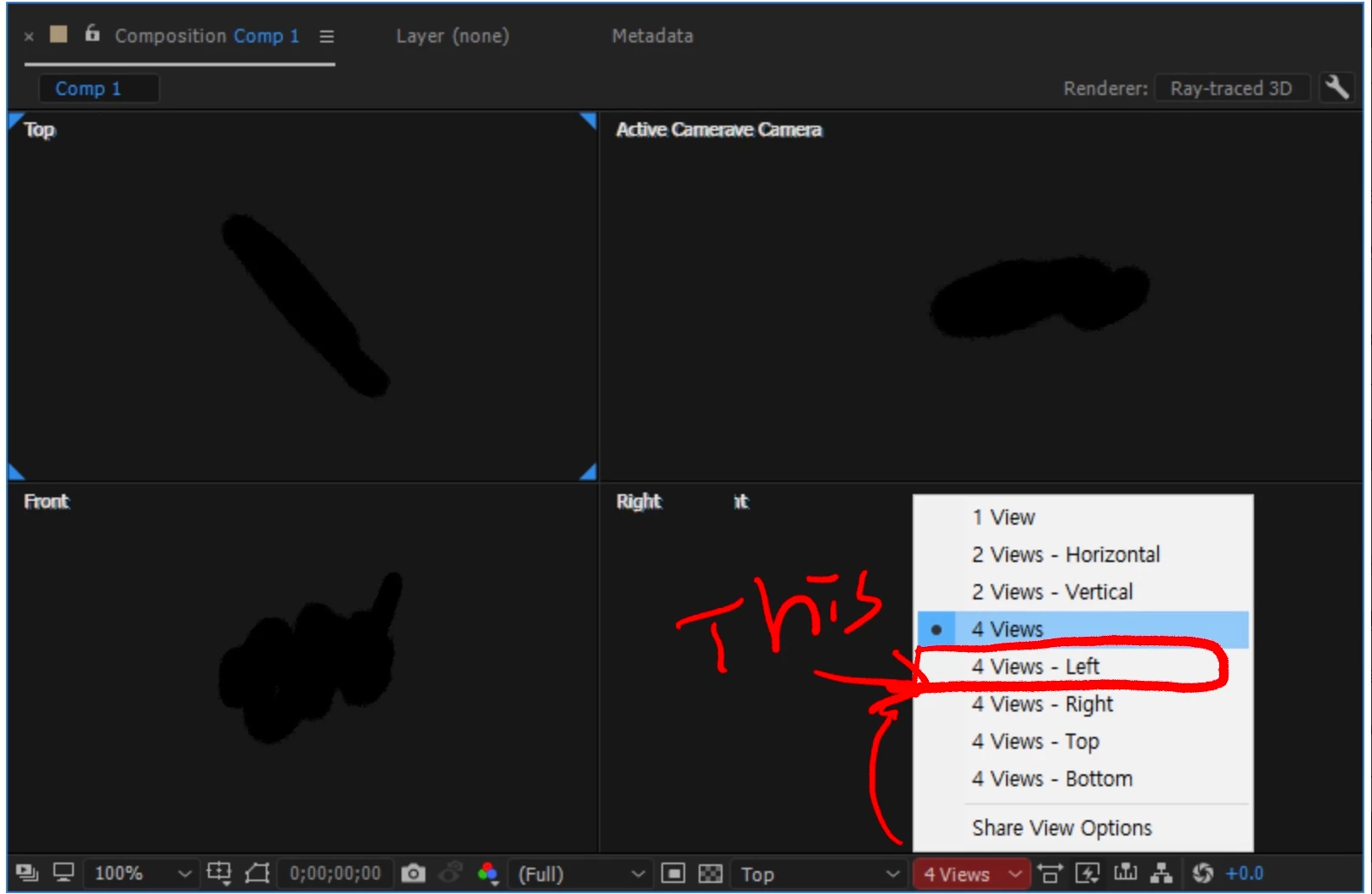 보기 수를 선택할 수 있으며 각 패널은 comp 패널 내부를 마우스 오른쪽 버튼으로 클릭하고 원하는 보기를 선택하여 원하는 보기로 설정할 수 있습니다.