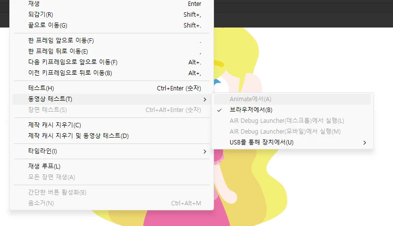 동영상 테스트(미리보기)가 애니메이트에서 실행이 안되고 브라우저에서 실행이 됩니다.