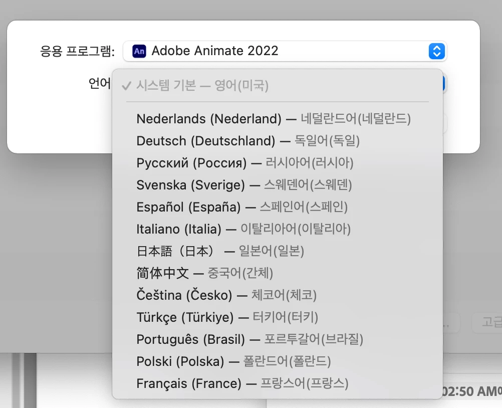 Mac os 에서 animate를 설치할 경우, 언어 설정을 한글로 했음에도 영어로 나오고 있습니다. mac 개인 설정으로 바꾸고 싶어서 animate에서 한글을 지원하고 있지 않습니다. 왜 한글을 쓸 수 없나요?