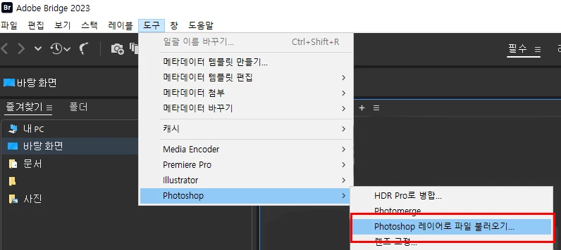 메뉴 > 도구 > photoshop > photoshop 레이어로 파일 불러오기 가 보이질 않습니다.