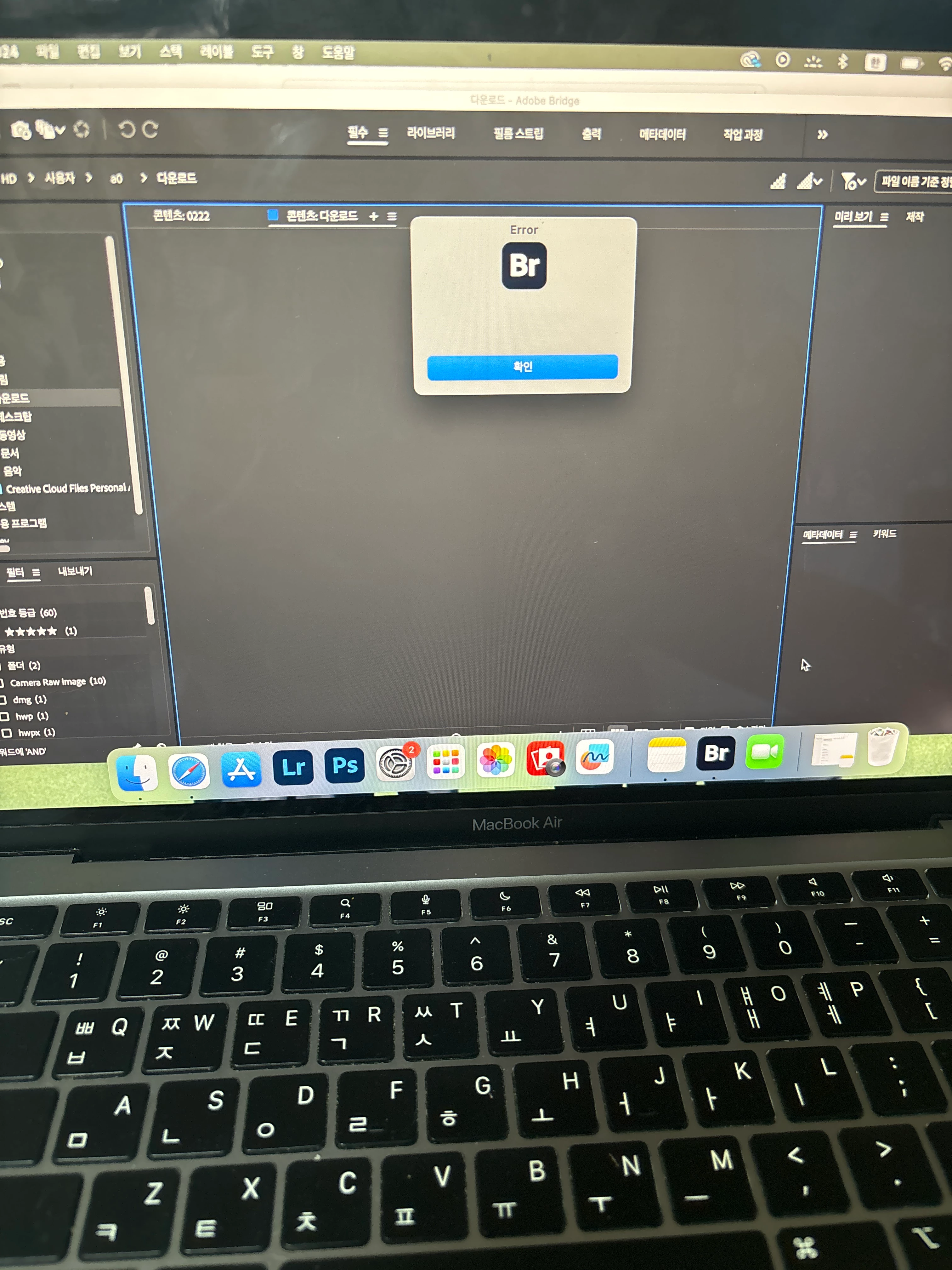어도비 브릿지 앱에 들어가면 사진대로 오류가 뜨고 확인 버튼을 누르면 자동으로 브릿지가 닫혀요