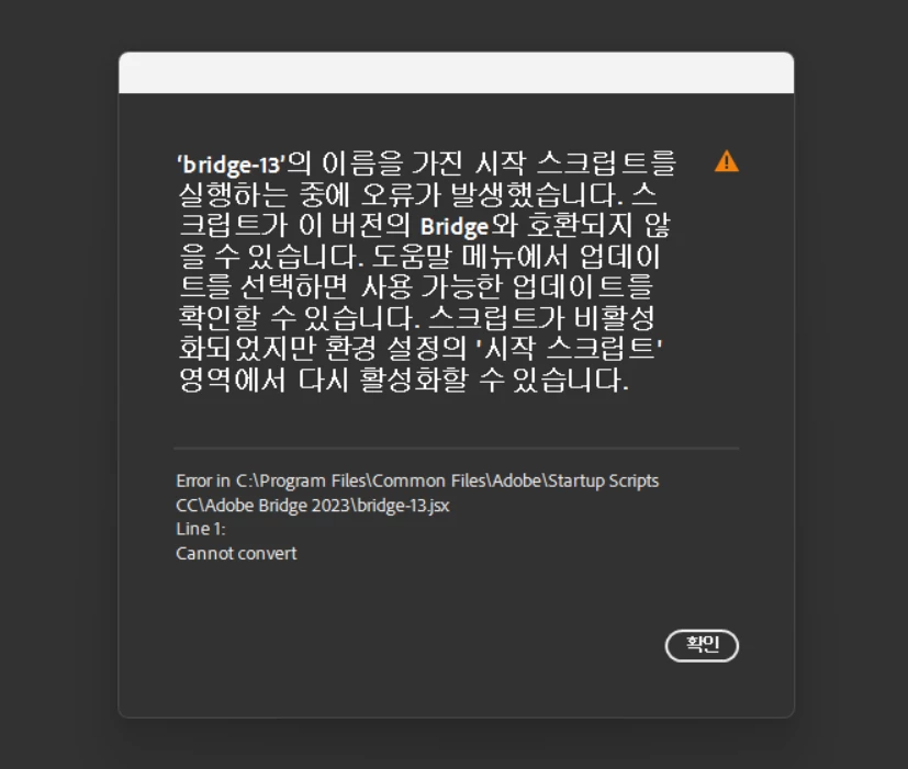 말씀해주신 메시지 뜨는 창은 Adobe Bridge의 시작 스크립트가 손상된 경우 Adobe Bridge가 충돌하거나 시작되지 않을 수 있어 비활성화하여 문제해결을 해야합니다.