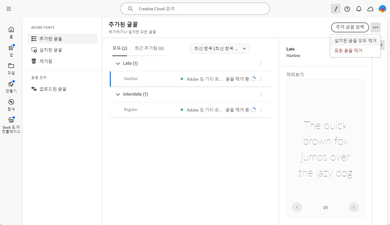 만약 글꼴제거에서 무한로딩이 있거나 추가가 지속되지 않을경우 OS의 문제일 확률이 높은데