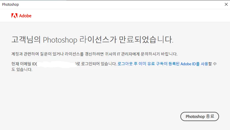 라이선스가 만료되었다고 합니다 로그아웃 후 재로그인해도 동일합니다.