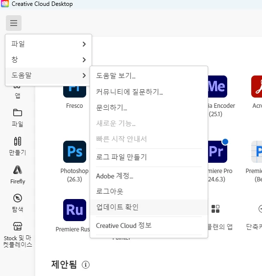 현재 사용하는 PC의 OS가 윈도우라면 클라우드창 좌상단의 삼지창 아이콘>도움말>업데이트 확인을 눌러서 크리에이티브 클라우드 업데이트를 진행합니다.