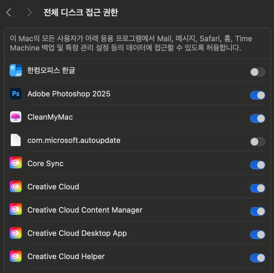 1. macOS 전체 디스크 자체 권한을 부여하실 수도 있습니다.
