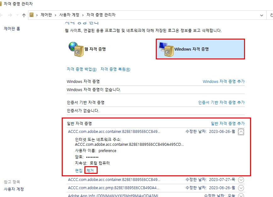 2. 윈도우 하단 왼쪽 검색창에서 " 자격 증명 관리자 " 실행하고 adobe를 전부 삭제해보세요