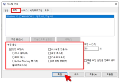 ③ 상단의 [부팅]을 선택 후, [부팅 옵션]을 이미지와 같이 선택 하여 [확인]을 선택합니다.