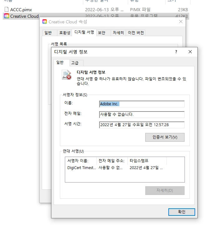 제가 의심 가는 문제는 설치된 어도비CC의 전자서명 문제이지 않을까 의심합니다.