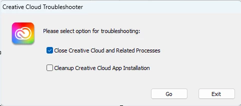• Close Creative Cloud and Related Processes를 체크 후, Go 버튼을 눌러  App을 재실행 해주세요.