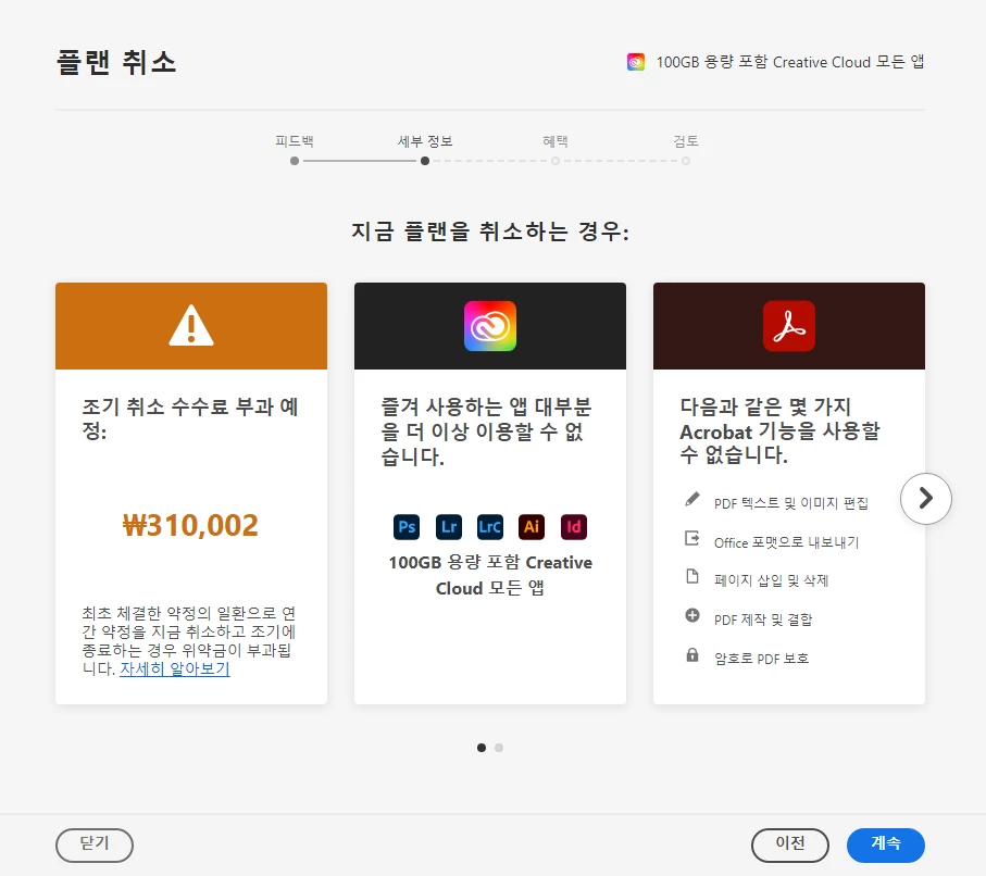 첫 해 이후로는 연간 약정이 요구되지 않습니다. 언제든지 Adobe 계정 또는 고객 지원 센터를 통해 취소할 수 있습니다.