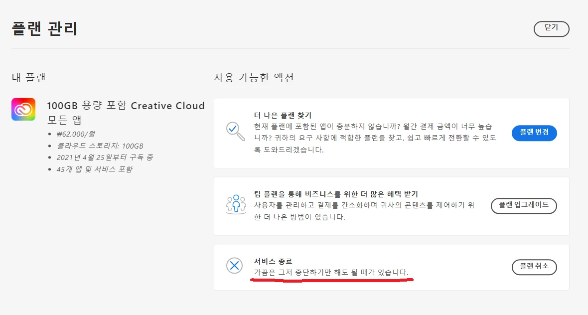 adobe에서 연간 플랜을 구독하면 평생 회원이 되는줄 몰랐습니다.