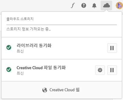 Creative Cloud 데스크탑 앱의 오른쪽 상단 클라우드 아이콘을 클릭 했을때, [스토리지 정보 가져오는 중] 상태라면 동기화가 안되는 상태 입니다.