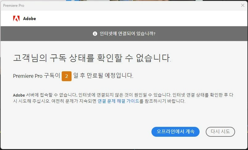 그런데 프리미어를 켜니 위처럼 갑자기 연결이 안 됩니다.