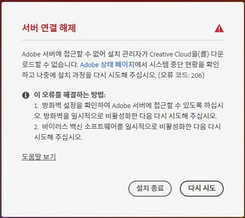 오류코드 206 때문에 creative cloud가 안 깔립니다.