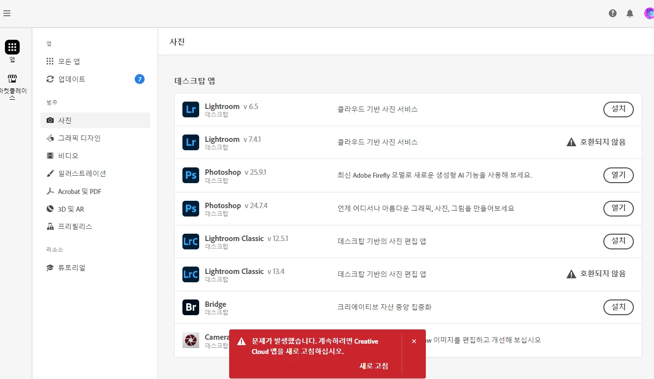 Creative Cloud를 업데이트 해야할 것 같아요.