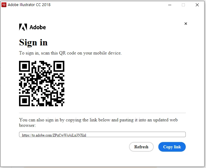 일러스트레이터 사용하려고 하니 sign in 화면이 떠서 큐알코드로 들어가 로그인 후 authentication 완료해도 아래 화면에서 변동이 없습니다.